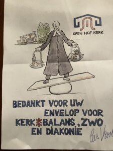 In deze tijd van kerkbalans zijn een aantal leden van onze gemeente actief met het rondbrengen en ophalen van de enveloppen, dit jaar is Cees Vrooland actief in de wijk waar ondergetekende woont. Uit ervaring weet ik dat het rondbrengen niet het grootste probleem is, maar het weer verzamelen kost soms wel moeite. (Nog niet ingevuld of andere excuses) Om Cees te helpen heb ik het antwoordformulier ingevuld en de enveloppe bij hem door de brievenbus gedeponeerd. Wat schertst mijn verbazing, dat ik de volgende dag toch een antwoord van Cees in mijn brievenbus vond. De tekening hiernaast heeft hij gemaakt (Cees kan mooi tekenen) en bij navraag wilde hij bedanken voor het inleveren van Kerkbalans.